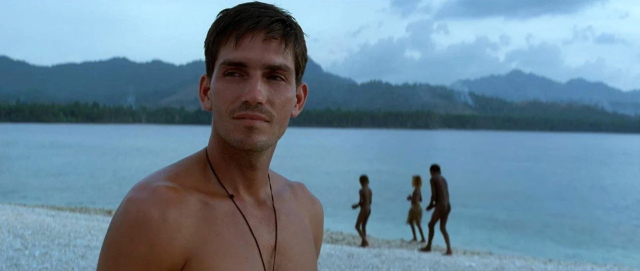 Le soldat Robert Witt (Jim Caviezel), pacifiste dans l’âme, déserteur de circonstance, préfère goûter à une vie hédoniste plutôt qu’à la dure condition de soldat. Sur ces îles Salomon, il est au contact de tribus locales qui vivent de peu, en harmonie (apparente) entre elles et en symbiose avec la nature. On pense à un monde d’avant le péché originel. Des enfants s’amusent, des adultes pêchent, des mamans protègent et éduquent leurs enfants, et Witt qui plonge dans une mer turquoise, Witt sur sa pirogue qui pagaie sereinement. Avec un sourire emprunt de bonté qui éclaire son très beau visage.