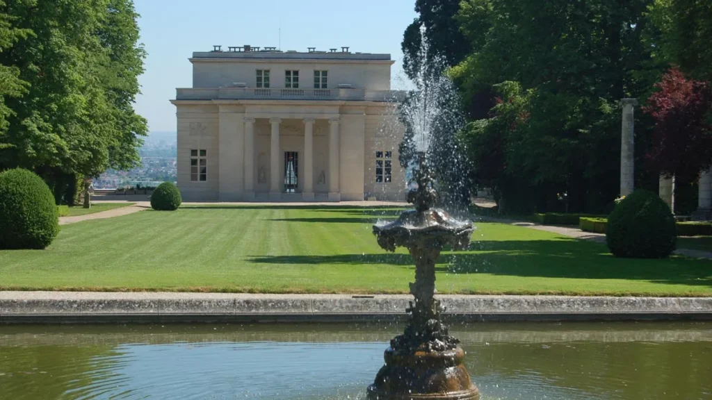 - Le Pavillon de musique qui est inscrit à̀ l’Inventaire supplémentaire des Monuments historiques depuis 1945, dispose de 1 355 m² habitables répartis sur une quinzaine de pièces principales, dont plusieurs salons prestigieux au rez-de-chaussée, des chambres et bureaux à l’étage, ainsi qu’un appartement à l’entresol et une cuisine à chaque niveau. Les décors intérieurs se distinguent par des dorés, boiseries et œuvres d’art de renom, comme un plafond peint par François Boucher et des panneaux signés Fragonard. La terrasse panoramique de 400 m² offre une vue sur la Seine, La Défense, le Mont Valérien et la tour Eiffel. Les dépendances comprennent un pavillon d’accueil, un ancien haras, deux garages et un vaste parking.