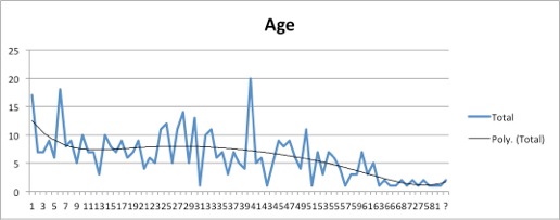En faisant l’analyse de l’âge des hommes, puisque l’âge des femmes n’est pas donné, on obtient la courbe des âges ci-après.