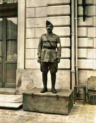 Photo : Jean-Paul Palewski le lendemain de la Libération de Louveciennes le 22 août 1944 devant la Mairie.