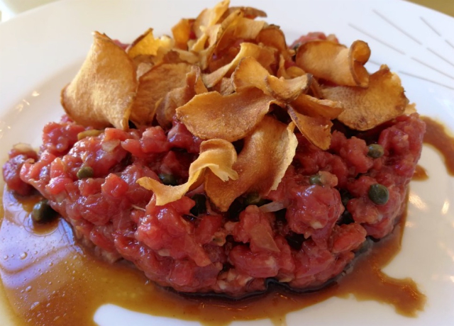 J’ai choisi un «tartare de bœuf de race charolaise» qui est arrivé préparé. La viande était fondante, l’assaisonnement bien relevé. Pour moi c’était parfait. Le tartare était accompagné de quelques frites et d’une minuscule coupelle de salade.