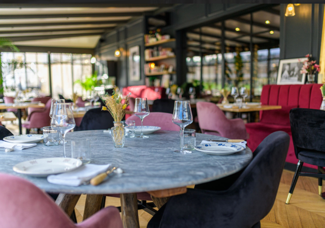 La salle a été redécorée dans un style cosy, teinte noire dominante, banquettes rouges, mini-bibliothèque, parquet en point de Hongrie. La grande verrière donnant sur l’abreuvoir a été conservée et élargie, l’entrée se faisant dorénavant sur le côté avec une vue impressionnante sur une cave vitrée, avec des bouteilles qu’on devine prestigieuses.